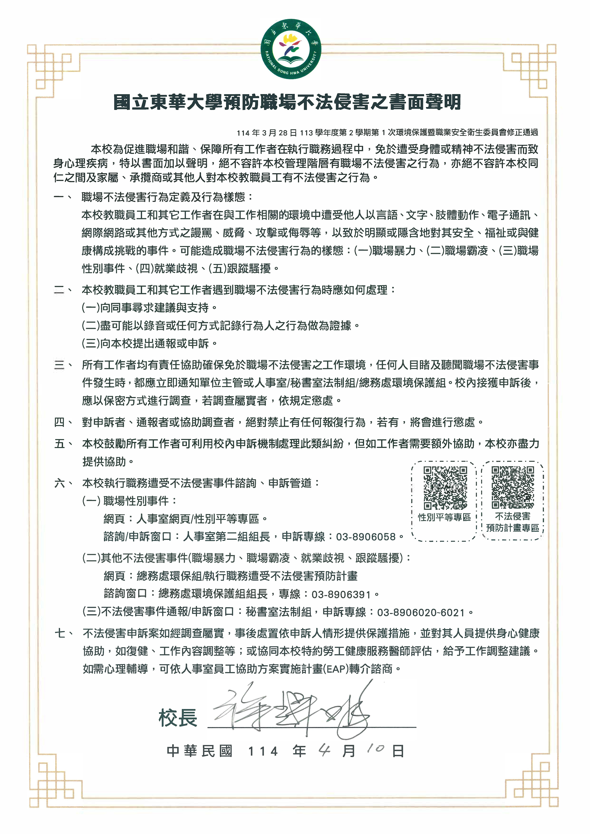 國立東華大學預防職場不法侵害之書面聲明